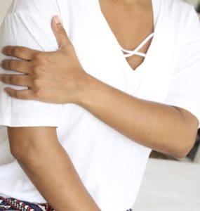 Als je je arm vasthoudt, neem dan de arm met de pijnlijke plek.